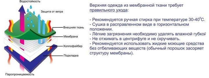 Мембранная ткань — это многослойные полотно, включающее такую плёнку. В готовых изделиях умные водоотталкивающие ткани не пропускают воду снаружи, но позволяют испаряться влаге, которая образуется внутри. Нижний слой мягкий, верхний — защитный, износостойкий. Средний — это защитный материал и мембрана.