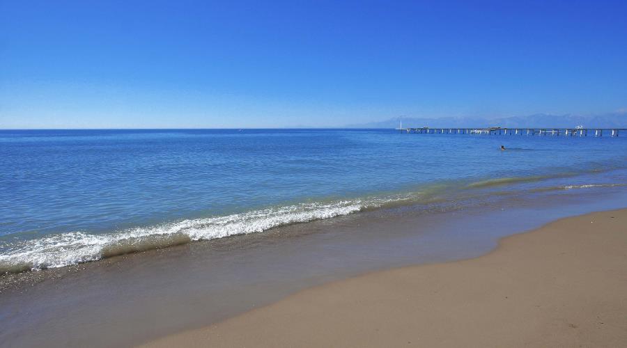 Огромный пляж вытянулся вдоль всего курорта на 16 км. Городские автобусы останавливаются у главного входа.