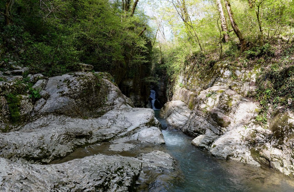 Местоположение — верховья реки Курджипс. Ущелье резко обрывается скалами высотой под четыреста метров. Его длина – пять километров. Берёт начало в Гуамке вместе с узкоколейной железной дорогой. Полотно тянется до посёлка Мемзай. Сейчас из-за оползня на узкоколейке завал. Ущелье – излюбленное место для скалолазов. Здесь проводятся соревнования, и есть больше двухсот разработанных трасс.