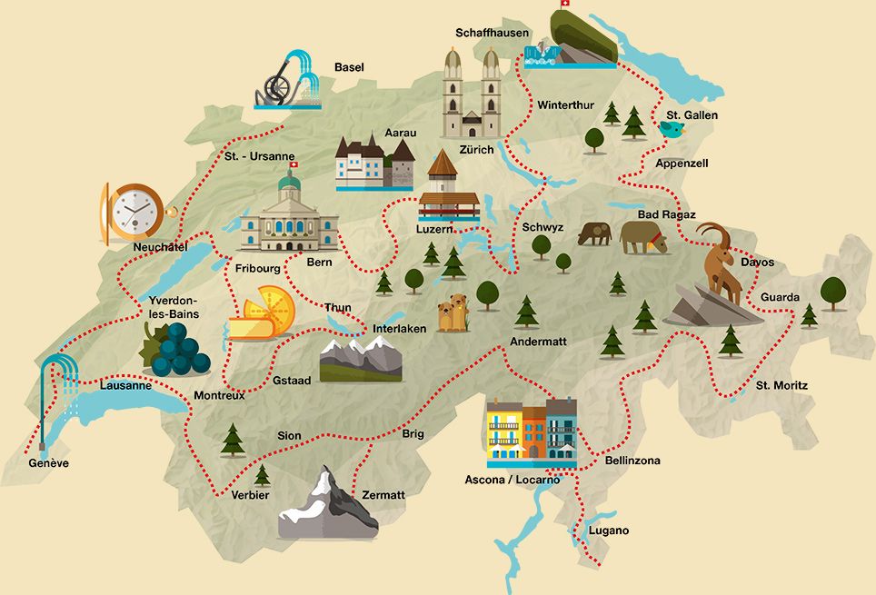 В задании предлагается привязать в координатную систему карту природных зон и карту туристического маршрута по территории Швейцарии. По результатам векторизации этих карт вы составите туристскую карту, показывающую прохождение маршрута по разным природным зонам.