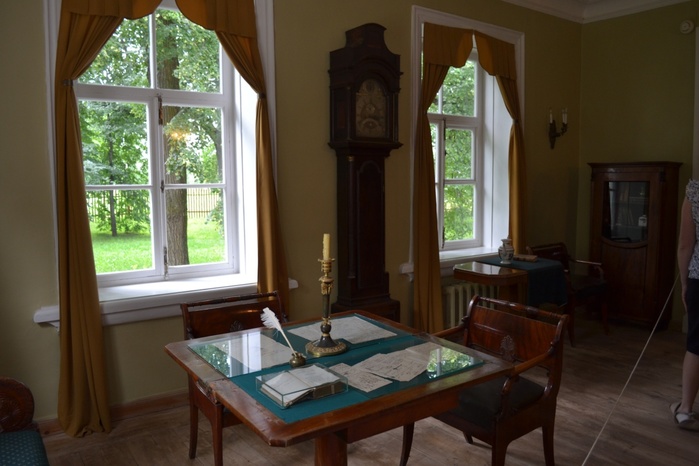 Мы пару часов гуляли по территории парка, а затем пошли в дом, где жили Пушкины. Он меня впечатлил: уютный деревенский дом. Но там нет почти ничего от самого Пушкина. Его кабинет восстановили по воспоминаниям и переписке, все вещи откуда-то привезены: стол — из Тригорского, кресло — друзей поэта, этажерка — его сына Григория. В других комнатах — портреты семьи и друзей Пушкина, копии его писем и черновиков.