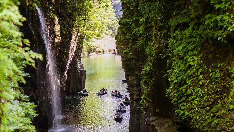 Ущелье Такатихо, образовавшееся в результате извержения горы Асо, представляет собой сверкающую узкую пропасть, прорезанную рекой Гокасэ. Пройдите достаточно далеко вниз, и вы увидите настоящий подвиг природы: 17-метровый водопад Минайнотаки, спускающийся к реке внизу, на красивом фоне густой зеленой листвы и тяжелых серых скал. Наслаждаться ущельем можно с двух точек зрения. Первый и наиболее рекомендуемый — это захватывающая прогулка на лодке. Прокат лодок доступен в южной части ущелья, где вода стоит спокойно и легче ориентироваться. Второй способ, для тех, кто хочет немного больше исследовать, — это пройтись по мощеным тропам, которые проходят вдоль края ущелья. Эта тропа продолжается около 1 км безмятежных видов. Это одно из 400 лучших мест в Японии, которое мы настоятельно рекомендуем обязательно посетить!