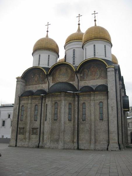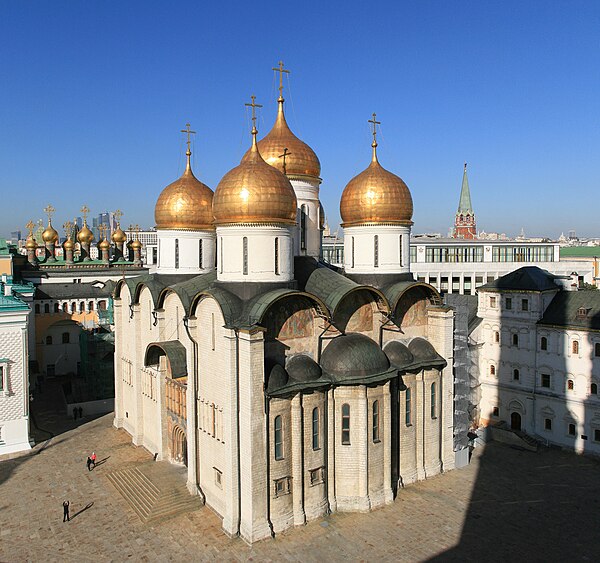 УСПЕ́НСКИЙ СОБО́Р Московского Кремля, кафедральный собор РПЦ, памятник архитектуры. Расположен на Соборной пл. Московского Кремля. Первый в Москве каменный храм на этом месте заложили 4.8.1326 митр. всея Руси Пётр и вел. кн. Иван I Данилович Калита (в 1472 разобран). У. с. построил в 1475–79 итал. арх. Аристотель Фиораванти, сочетая традиционные для др.-рус. иск-ва формы (пятиглавие, завершение стен закомарами, аркатурно-колончатый пояс и др.) и ренессансные принципы геометрически правильной формы и рациональной организации пространства. Внутри собор разделён 6 столпами (2 квадратных на востоке и 4 круглых в наосе) на 12 равных ячеек, перекрытых крестовыми сводами. Смещение куполов к алтарной части и равный диаметр проёмов барабанов подчёркивают симметрию интерьера. В алтарной части устроены 3 придела: Петропавловский (с севера), Дмитровский (с юга) и придел Похвалы Богоматери (на своде ризницы, под юго-вост. куполом). При возведении собора впервые в рус. архитектуре использованы кованые металлич. связи.