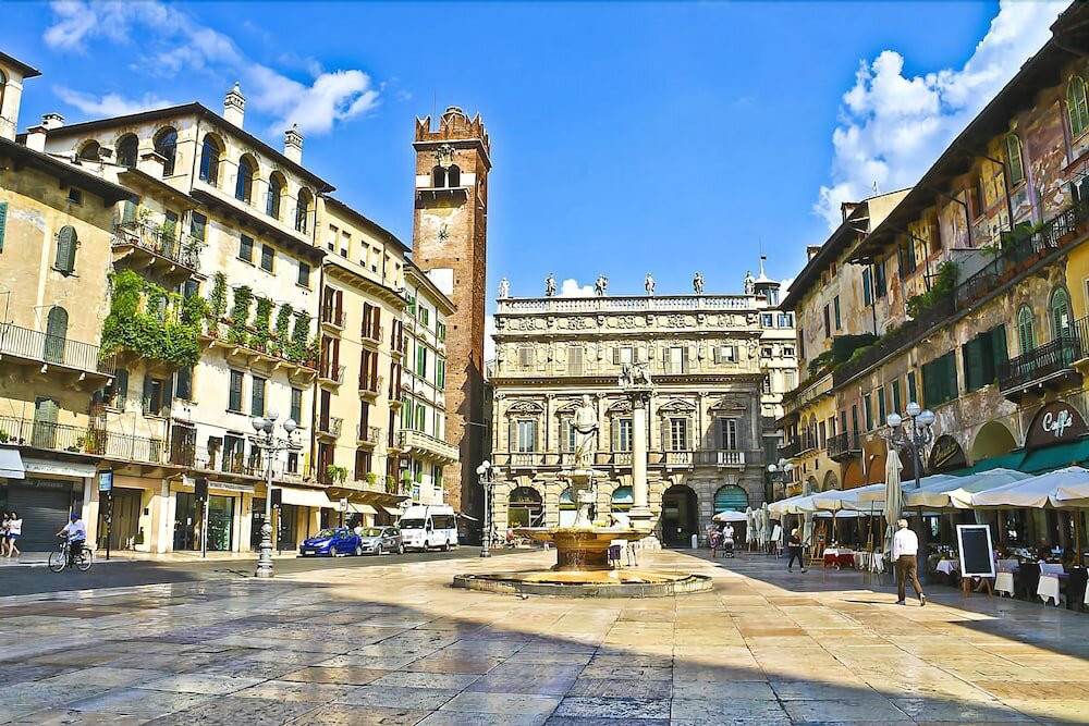 Пьяцца делле Эрбе — главная площадь города, и днем это оживленное место, заполненное киосками с фруктами и овощами, а также кафе, магазинами и ресторанами по бокам.