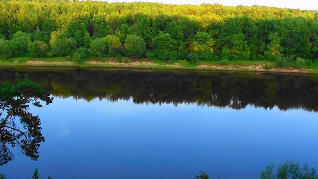 Правый берег — высокие сосны, ели, кое-где пихты и лиственницы. Левый — низкие заросли ивняков, затопляемых половодьем…