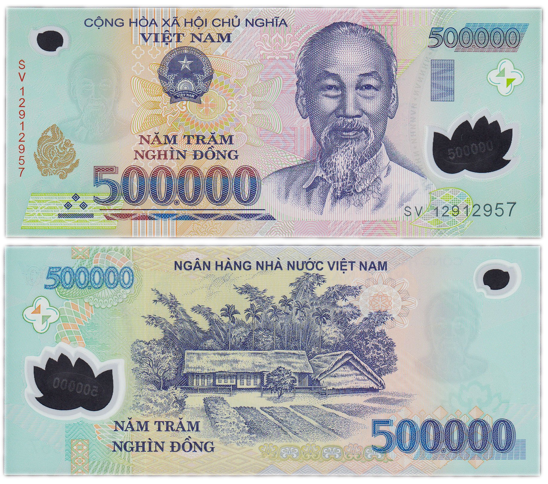 - На купюре в 500 000 донгов с обеих сторон изображён портрет Хо Ши Мина. Водным знаком также является изображение этого государственного деятеля.