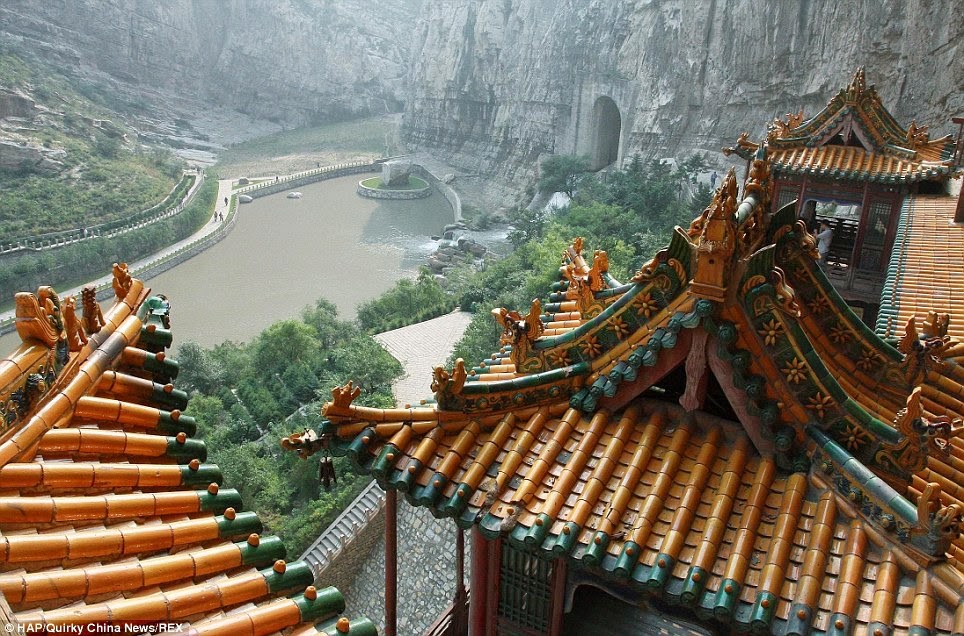 Издали храм напоминает яркий картонный домик, приклеенный к горе. Внизу, по узкому и короткому ущелью Цзиньлун («Золотой дракон»), ныне перегороженному дамбой, течёт река Хунь. От монастыря вверх вдоль отвесной скалы был проложен дощатый мост, нависающий над пропастью.