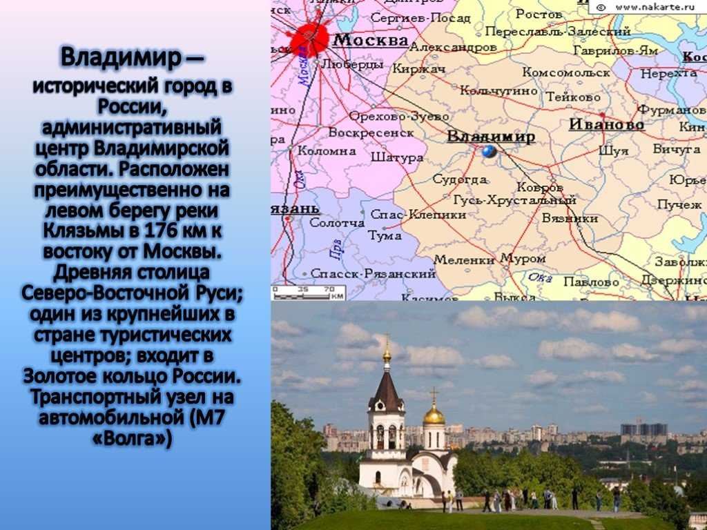 Древнейшая центральная часть Владимира лежит на высоком левом берегу реки Клязьмы, на круто спускающихся к реке холмах, разделенных глубокими оврагами. Клязьма протекает через город на протяжении 2,5 км и еще 5 км по границе города; ширина реки во Владимире около 130 м.