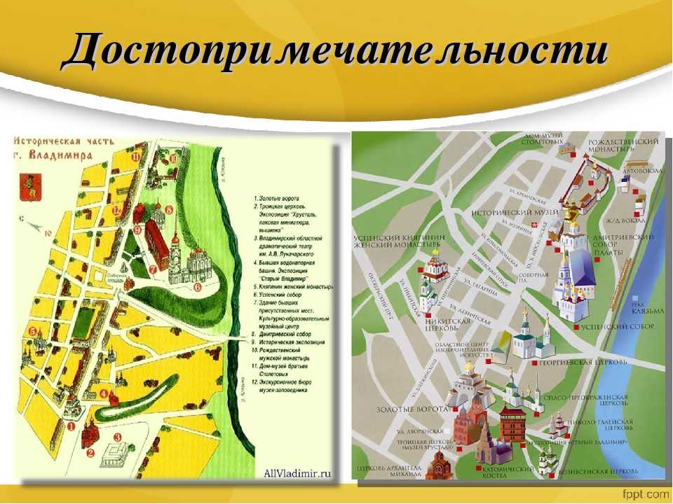 В первую очередь Владимир – это город-музей с уникальными памятниками истории и архитектуры – тремя белокаменными памятниками домонгольской архитектуры, признанными объектом Всемирного наследия ЮНЕСКО в составе объекта «Белокаменные памятники Владимира и Суздаль». Это Успенский собор (1158-1189 гг.), Дмитриевский собор (1194-1197 гг.), Золотые ворота (1158-1164 гг.).