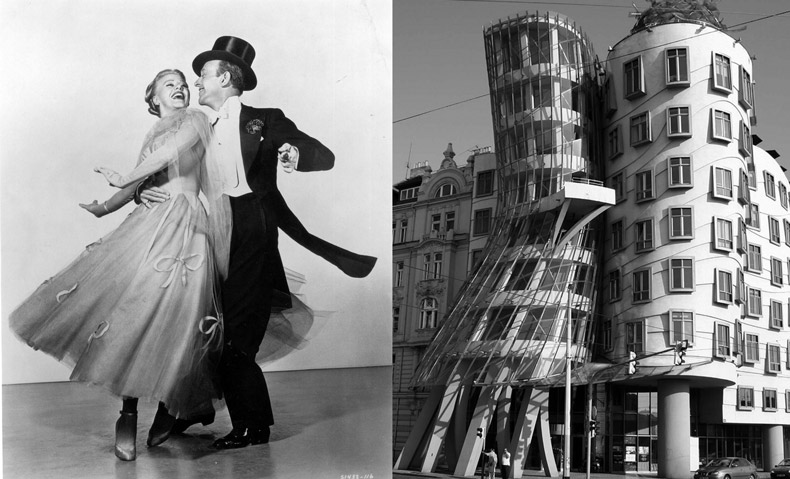 Если внимательно взглянуть на Танцующий дом в Праге, то действительно можно найти сходство. Прямое массивное строение напоминает мужской образ Фреда Астера, а стеклянное, чуть наклоненное здание, зауженное в середине наподобие талии, — напоминает изящную женскую фигуру актрисы Джинджер Роджерс.