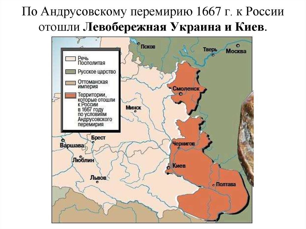 По Андрусовскому перемирию, Россия получила Смоленск и все земли, утерянные ею в Смутное время, а также Левобережную Украину с временным владением Киевом (затем оно стало постоянным). Запорожская сечь получала автономию. Белоруссия и Правобережная Украина остались за Речью Посполитой. Для России эта война оказалась одной из самых длительных, она растянулась с перерывами на тринадцать лет. Выступив в нем как защитница православия и своих единокровных братьев, Москва сражалась уже не только за изменение своих границ, но и за восстановление жизненного пространства восточнославянского мира. После этой войны католическая Европа, распространившая свое влияние до берегов Днепра, начала откатываться назад.