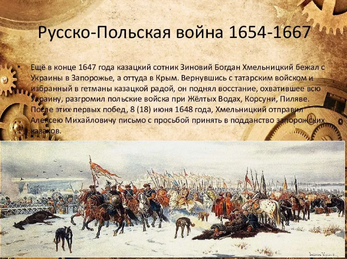 В 1657 г. умер Богдан Хмельницкий. По инициативе старшин гетманом был избран Иван Выговский, сторонник союза с поляками. Он тайно заключил с ними Гадячский договор (1558), предусматривающий федеративный союз Польши с Малороссией. Договор давал казачьей верхушке права польской аристократии и высокие привилегии. Объединившись с крымским ханом, Выговский установил свою власть на Украине, подавив народное недовольство с помощью поляков. В результате события приобрели неблагоприятный для Москвы оборот. Польша, приобретя нового союзника, возобновила войну против России.
