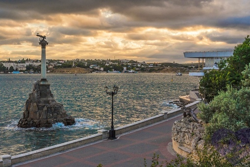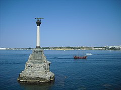 Памятник затонувшим кораблям .Это самый известный памятник Севастополя, изображенный на гербе города. Эта изящная колонна с коринфской головой, увенчанной бронзовым орлом, установлена на искусственной скале в море к пятидесятилетию первой обороны города в 1905 году.