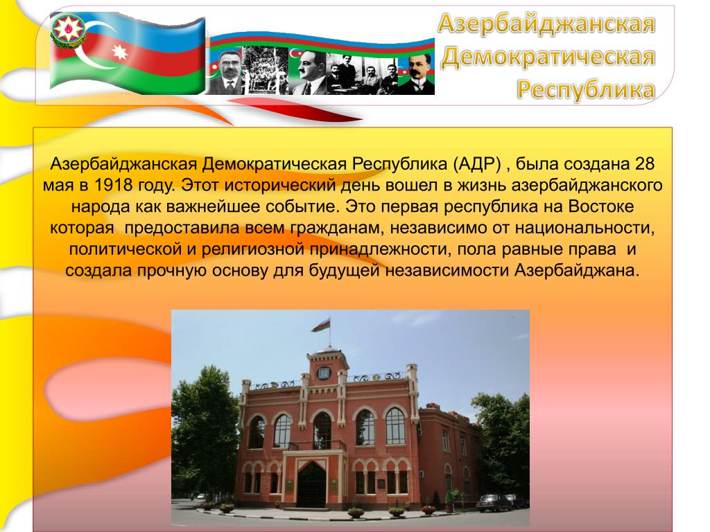 Азербайджан был независимым государством с 1918 по 1920 год, но затем был включен в состав Советского Союза. В 1936 году стала составной (союзной) республикой. Азербайджан провозгласил суверенитет 23 сентября 1989 года и независимость 30 августа 1991 года.