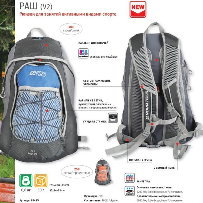 Особенности: Большие передние карманы на молнии, доступные карманы для бутылок с водой, карман на поясном ремне, защита от влаги, чехол от дождя
