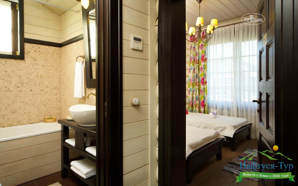 Великолепные номера, оформленные в стиле классической элегантности, оборудованы на любой взыскательный вкус. На открытых террасах можно прекрасно провести время, устроить чаепитие, любуясь невероятно красивыми окружающими пейзажами. Гости в восторге от услуг СПА-центра. На территории есть закрытый бассейн, баня в турецком стиле, фитнес-центр, теннисный и бильярдный столы.Выступления аниматоров, вкусные завтраки, обеды и ужины, уровень обслуживания, который характеризует фраза: «Здесь не к чему придраться!»