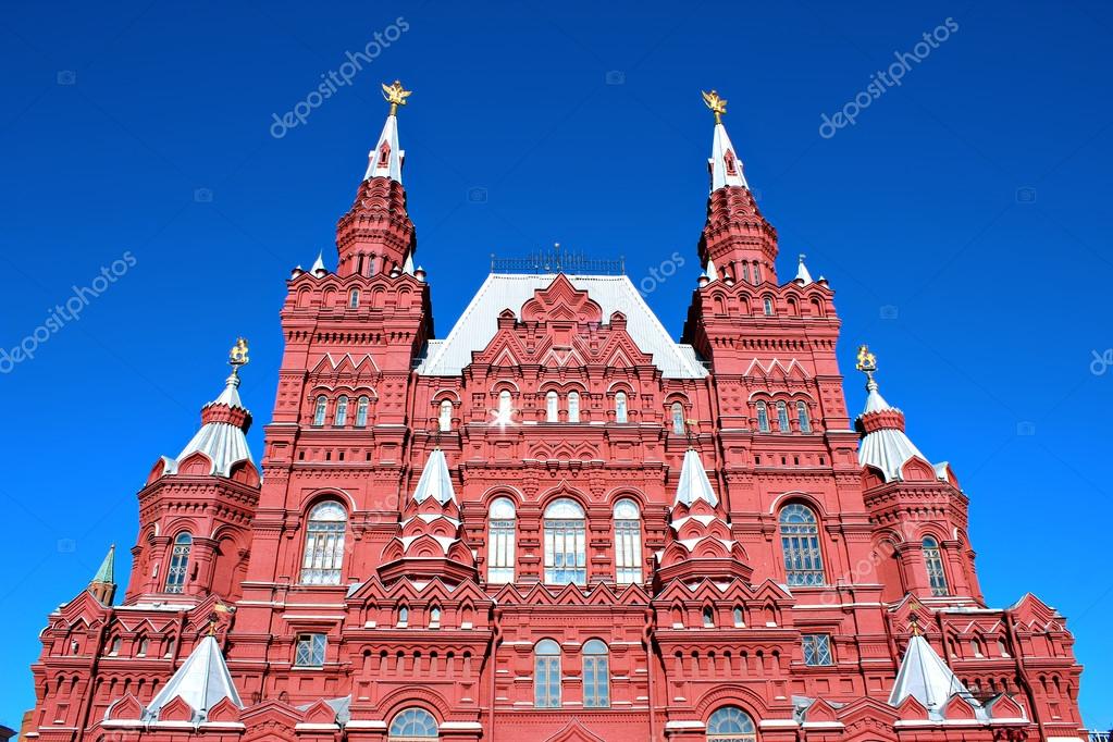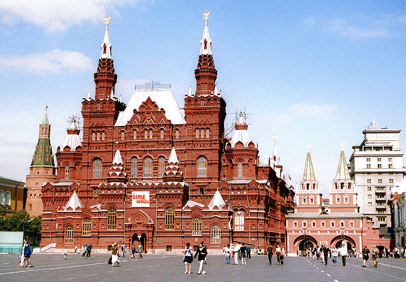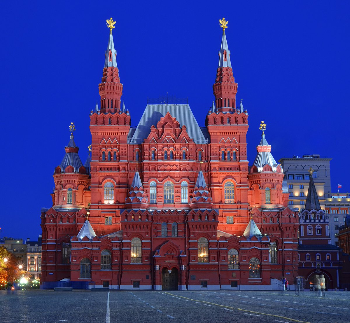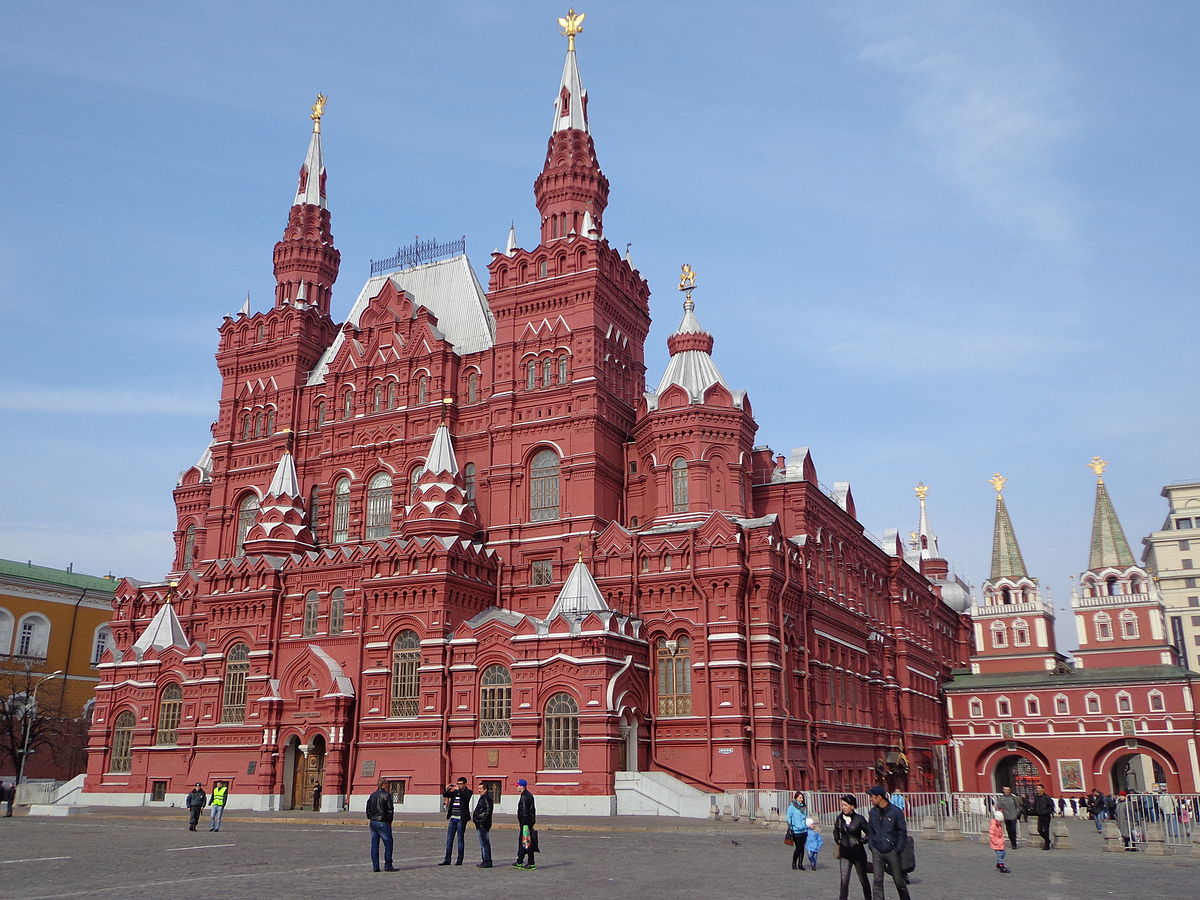 Внушительный малиновый В здании на северной стороне Красной площади находится Государственный Исторический музей. Это было построен, чтобы увековечить национальную историю России и проследить развитие России и ее народа с древнейших времен до конца 19 века. век.Его экспозиции включают реликвии доисторических племен, которые некогда населявшие территорию современной России, а также бесценные произведения искусства, принадлежащие члены династии Романовых.