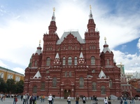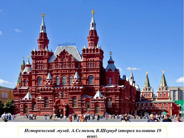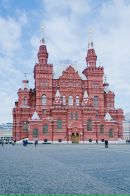 Читать полностью Свернуть Музей, ДостопримечательностьАнсамбль Красной площади невозможно представить без Исторического музея. Огромное краснокирпичное здание, напоминающее нарядный древнерусский терем, было возведено на северном конце площади (напротив Собора Василия Блаженного) в 1875–1883 годах. Авторами архитектурного шедевра стали выдающиеся российские зодчие В.Шервуд и А.Семёнов. Неслучайно присутствие в декоре здания символических элементов: навершиями главных башен являются двуглавые орлы, а малые боковые шатры венчают фигуры львов и единорогов.