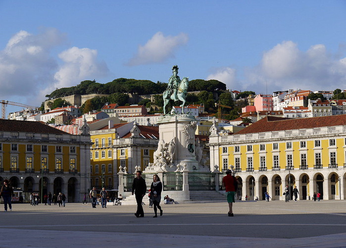 Архитектурная история португальской столицы начинается у стен замка Святого Георгия. Грозная крепость расположена на высоком холме, служившем дозорным пунктом еще римским легионерам, и видна практически из любого квартала. Огромный, выложенный плиткой «квадрат», упирающийся в берега реки Тежу, – это Праса-ду-Комерсиу или Торговая площадь. Когда-то по соседству находился королевский дворец, а в примыкающей к площади гавани швартовались корабли Васко да Гамы и Фернана Магеллана. Однако после 1755 года дворец рассыпался в пыль, а Праса-ду-Комерсиу выросла в размерах и приобрела более претенциозный облик.